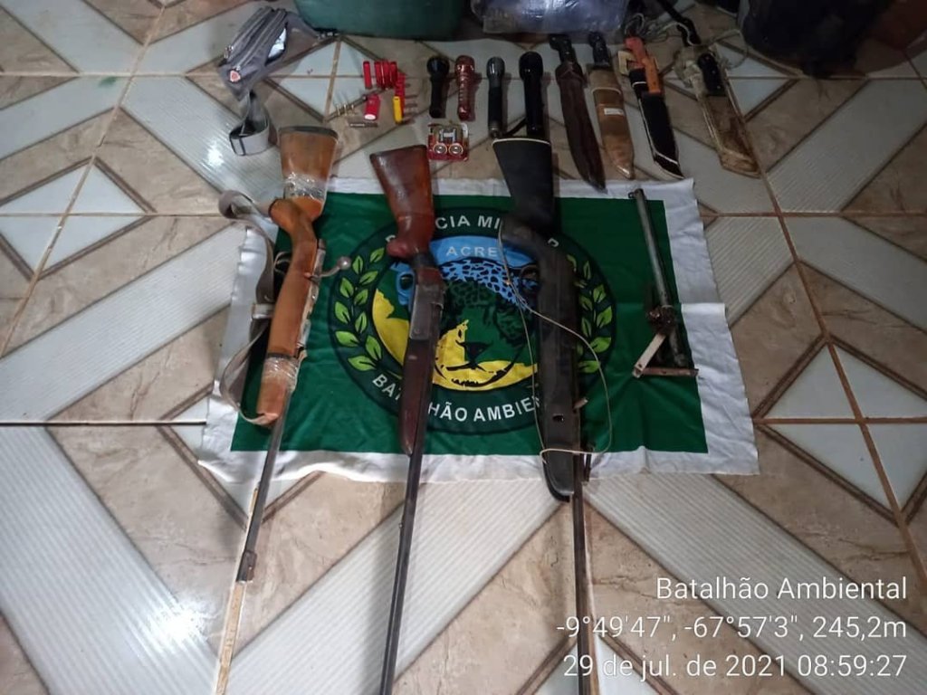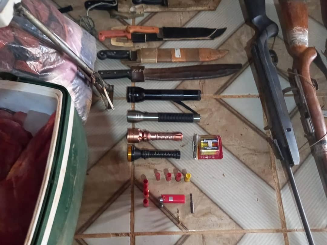 Como resultado da ação foram apreendidas quatro armas de fogo sendo uma espingarda calibre. 28, um rifle calibre .22, um rifle de pressão adaptado para o calibre .22 e uma espingarda artesanal do calibre .36, além de vários cartuchos desses calibres, entre deflagrados e intactos, quatro facões, lanternas, materiais e utensílios para a montagem do acampamento dos caçadores.