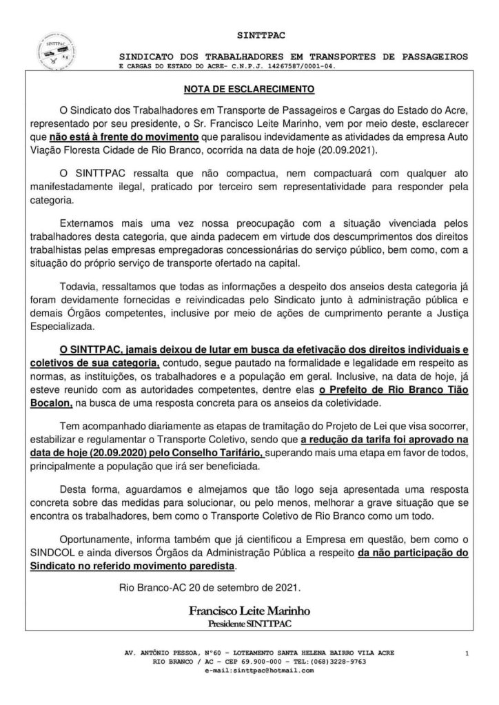 O Sindicato dos Trabalhadores em Transporte de Passageiros e Cargas do Estado do Acre, representado por seu presidente, o Sr. Francisco Leite Marinho, vem por meio deste, esclarecer que não está à frente do movimento que paralisou indevidamente as atividades da empresa Auto Viação Floresta Cidade de Rio Branco, ocorrida na data de hoje (20.09.2021).