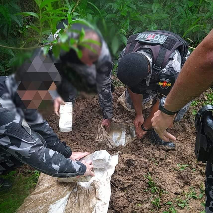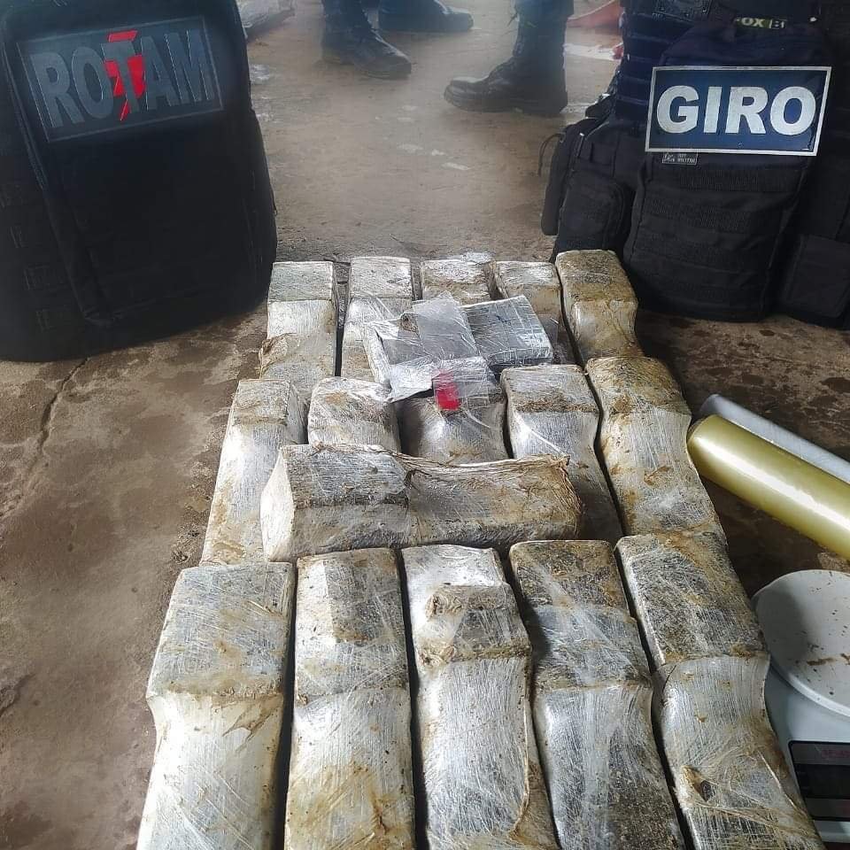 Dadas as fundadas razões da existência do crime denunciado, foi realizado cerco no local e após averiguação em uma residência foram localizados objetos típicos de preparo e venda de entorpecentes, tais como sacos plásticos, papel filme, balança de precisão, tesoura, uma pequena barra de maconha e uma quantia em dinheiro totalizando R$ 470,00 (quatrocentos e setenta reais), um saco de substância aparentando ser barrilha. Ainda durante as buscas, foi localizado enterrado próximo à entrada da casa um “tijolo” de substância aparentando ser maconha, pesando aproximadamente 465 gramas. Em um local de mata, também foi localizado enterrado mais 16 (dezesseis) peças de substância aparentando ser maconha, de mesma característica do material aprendido próximo à entrada da casa, sendo no total aprendido 16,715 Kg.