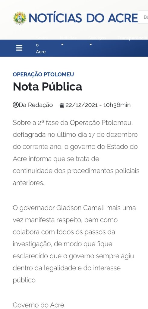 Sobre a 2ª fase da Operação Ptolomeu, deflagrada no último dia 17 de dezembro do corrente ano, o governo do Estado do Acre informa que se trata de continuidade dos procedimentos policiais anteriores.