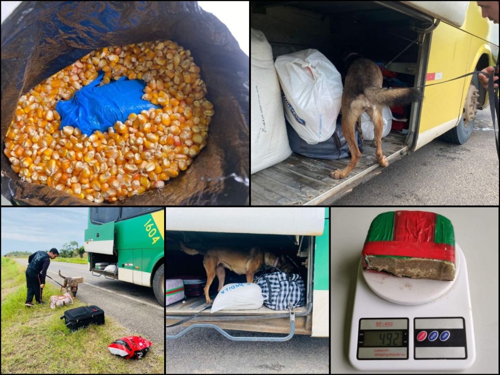 Nas buscas, com auxílio da Cão Policial “Amora”, foram encontradas com umas das passageiras, aproximadamente meio quilo de drogas e um quilo e meio de carne silvestre.