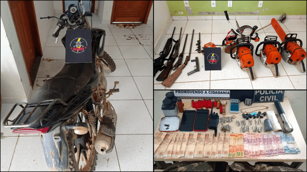 Com ele foram apreendidas espingardas modificadas, munições de diversos tipos e calibres, dezenas de embalagens de drogas, entre elas maconha e cocaína, cerca de 775 reais em dinheiro, e diversos objetos oriundos de roubos e furtos, entre eles celulares, motosserra e uma motocicleta.