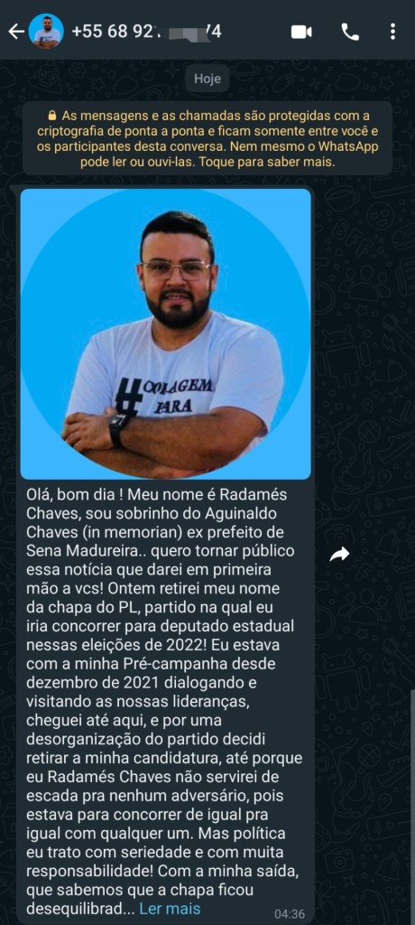 “Olá, bom dia ! Meu nome é Radamés Chaves, sou sobrinho do Aguinaldo Chaves (in memorian) ex prefeito de Sena Madureira.. quero tornar público essa notícia que darei em primeira mão a vcs! Ontem retirei meu nome da chapa do PL, partido na qual eu iria concorrer para deputado estadual nessas eleições de 2022!