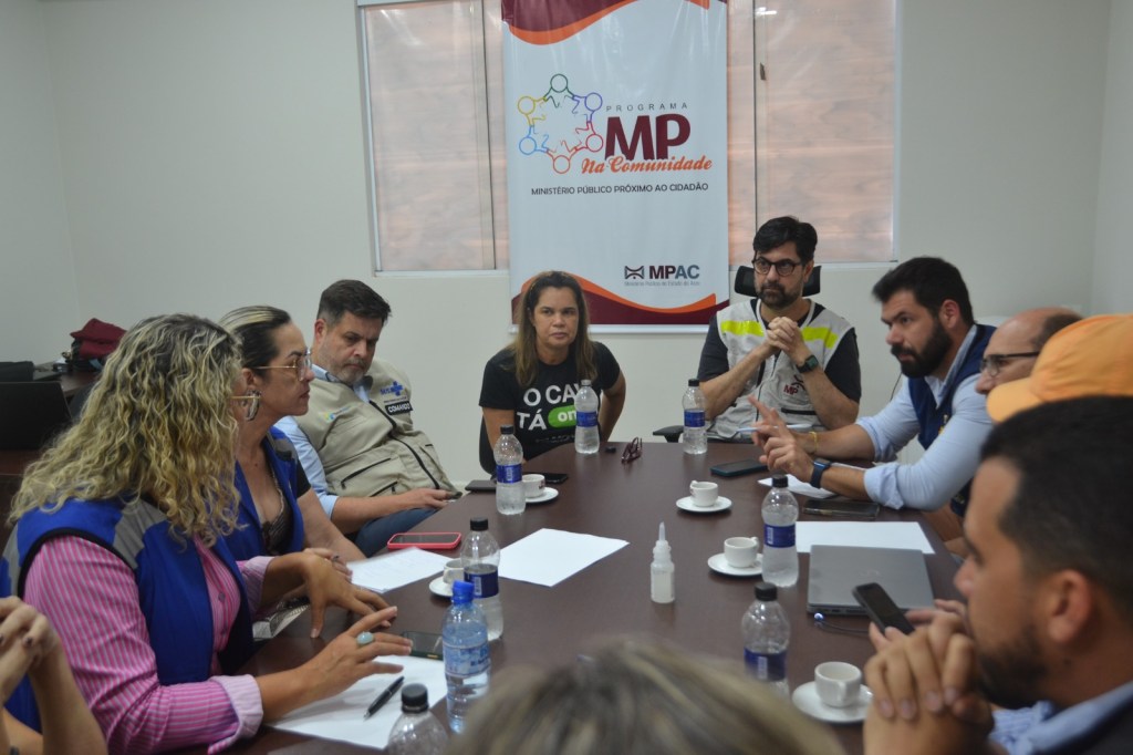 O Ministério Público do Estado do Acre (MPAC) promoveu na última sexta-feira (31), na base instalada no Parque de Exposições, uma reunião com representantes do Ministério da Saúde, Secretaria de Estado de Saúde do Acre (Sesacre) e Secretaria Municipal de Saúde de Rio Branco (Semsa). O encontro teve como objetivo tratar sobre a atuação integrada dos órgãos de saúde buscando melhor atender a população afetada pelas cheias do rio Acre e igarapés.