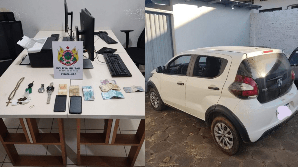 Os militares foram ao local e constataram que o veículo estava com restrição de roubo e os três indivíduos estavam com o carro. Foram encontrados com eles dinheiro, aparelhos celulares e relógio sem procedência comprovada.