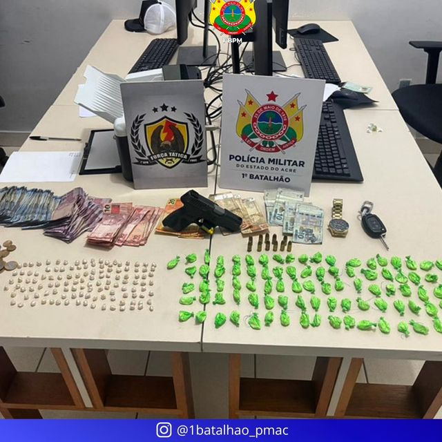 Militares do 1º Batalhão da Polícia Militar do Acre (PMAC) prenderam um homem na noite desta terça-feira, 1, com uma arma de fogo, munições, drogas e dinheiro, durante abordagem a um veículo na rua Valdomiro Lopes, no Bairro da Paz.