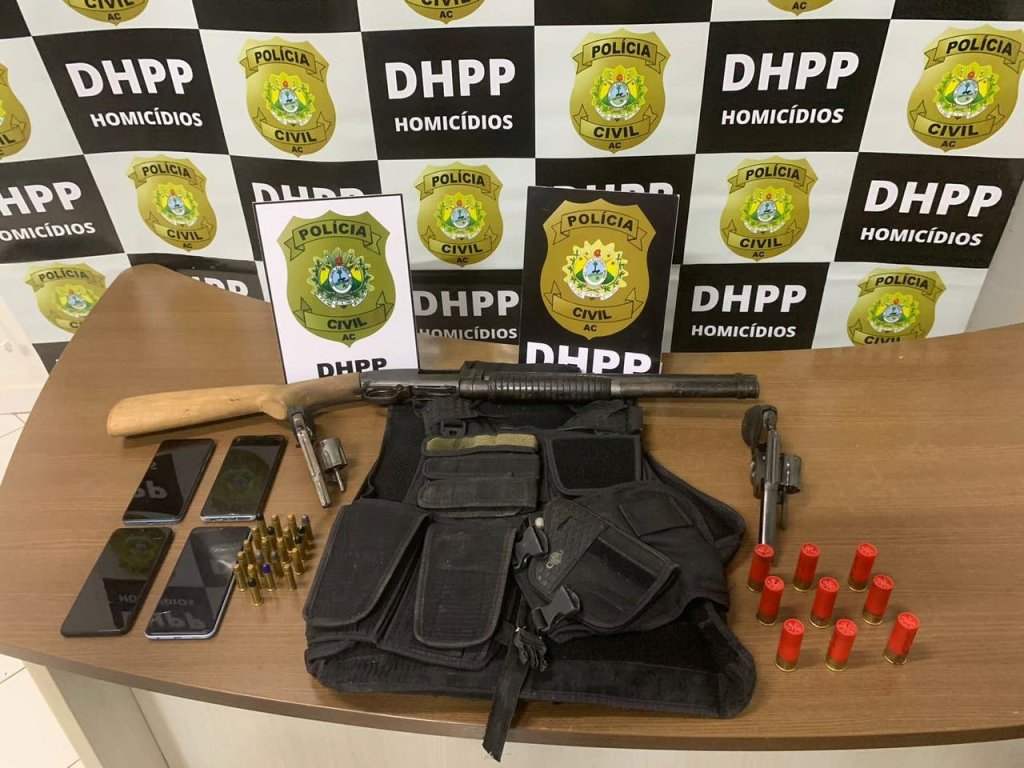 Com os presos foram apreendidas: 03 armas de fogo, sendo uma arma longo calibre .12; 02 revólveres calibre .38, além de munições para os armamentos e um colete balístico.