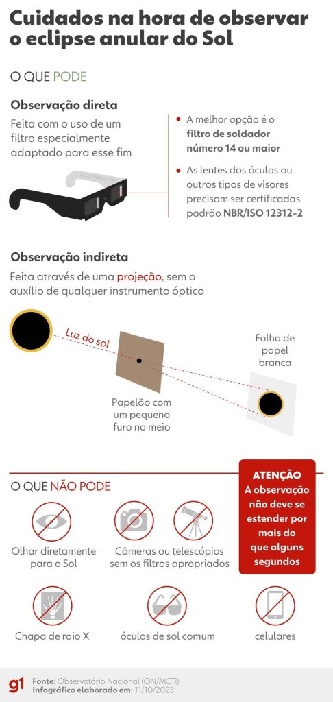 No entanto, mesmo com os óculos com filtro 14, a exposição deve se estender por muito tempo. Emerson Castro orienta que a pessoa olhe por menos de 30 segundos, pare um pouco e depois volte a olhar.