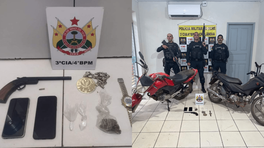 A equipe policial conseguiu render o homem e a mulher que permaneceram na casa, onde havia uma arma de fogo, munições calibre.22, um tablete de maconha pesando 23,5 kg, duas trouxinhas de cocaína pesando 8,4 kg, duas motocicletas roubadas e dois celulares. No local, a mulher que estava na casa com os dois irmãos apresentou-se à guarnição como irmã dos suspeitos e que estaria sendo mantida em cárcere privado. Diante dos fatos, a guarnição encaminhou o suspeito, a vítima e todo o material apreendido à delegacia de Acrelândia.