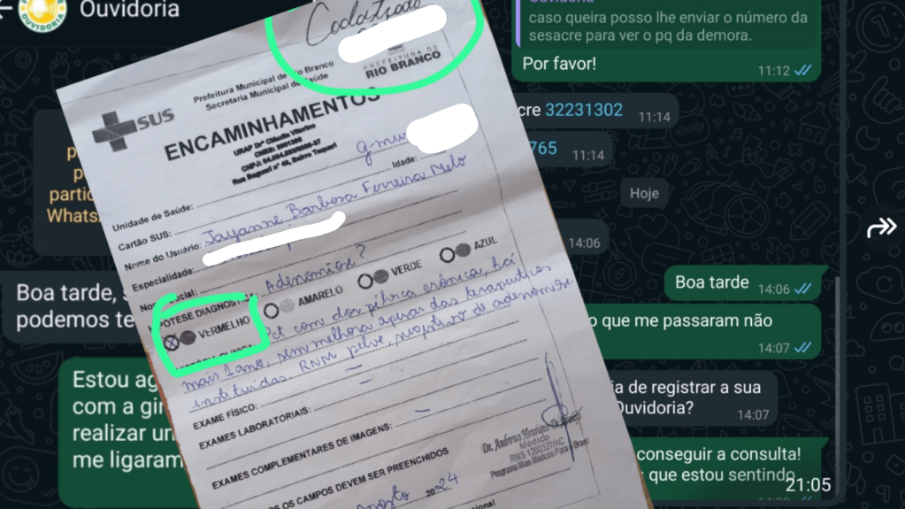 “Ja vai completar 1 mês e continuo aguardando o bendito contato e nada da consulta. Ja busquei informações com a própria urap, com a Fundhacre e a própria Sesacre e eles até hoje não consegui sequer uma resposta. Estou sofrendo com fortes dores, inchaço e ninguém me ajuda. Estou desesperada!”, disse Jayanne.